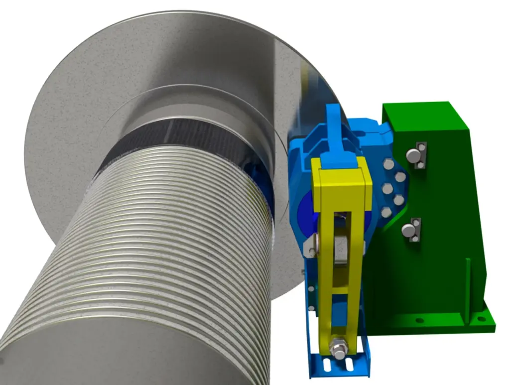 Brzdný moment je vytvářen pomocí pružin, které zajišťují zabrzdění jestliže v hydraulickém okruhu není tlak. Odbrzďování je řešeno pomocí hydromotoru. Také v případě výpadku elektrické energie, poškození nebo ztráty tlaku v hydraulickém systému vždy dojde automaticky k zabrzdění pohybu lanového bubnu.