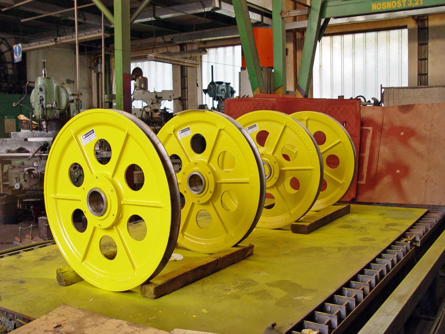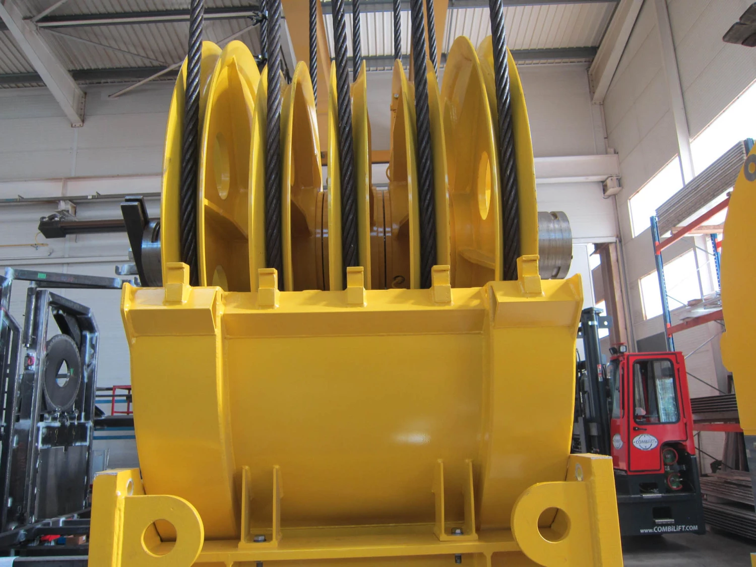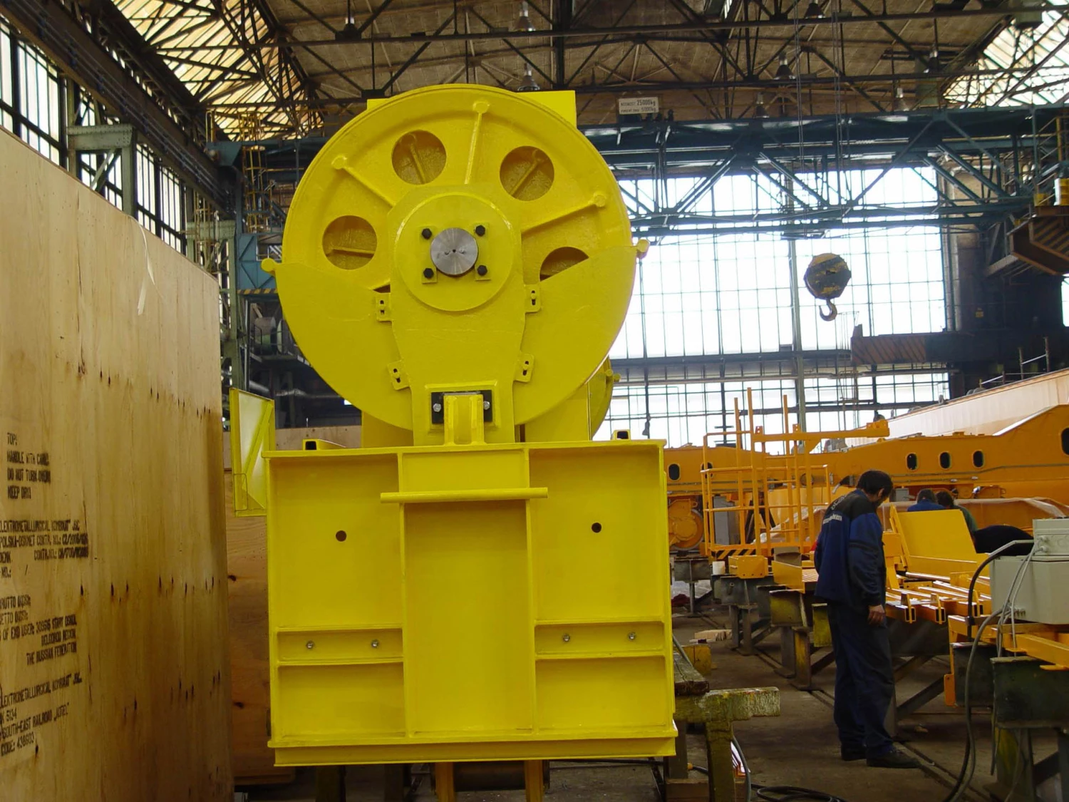Po hlavních nosnících pojíždí jeřábová kočka, případně je pod nimi podvěšena. Jeřáb pojíždí po ocelových kolejnicích uchycených do betonového tělesa jeřábové dráhy, zabudované v terénu. Elektrické napájení (hlavní trolej) je často řešeno kabelem na kabelovém bubnu, případně trolejí v souběžném kanálu. Ovládání jeřábu je z kabiny, dálkovým ovládáním, případně zavěšeným panelem.