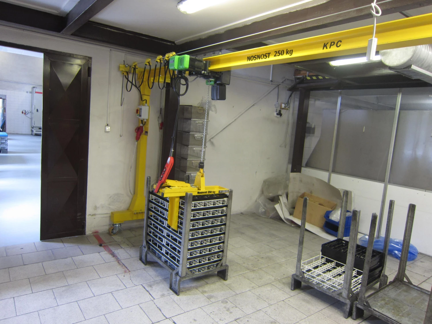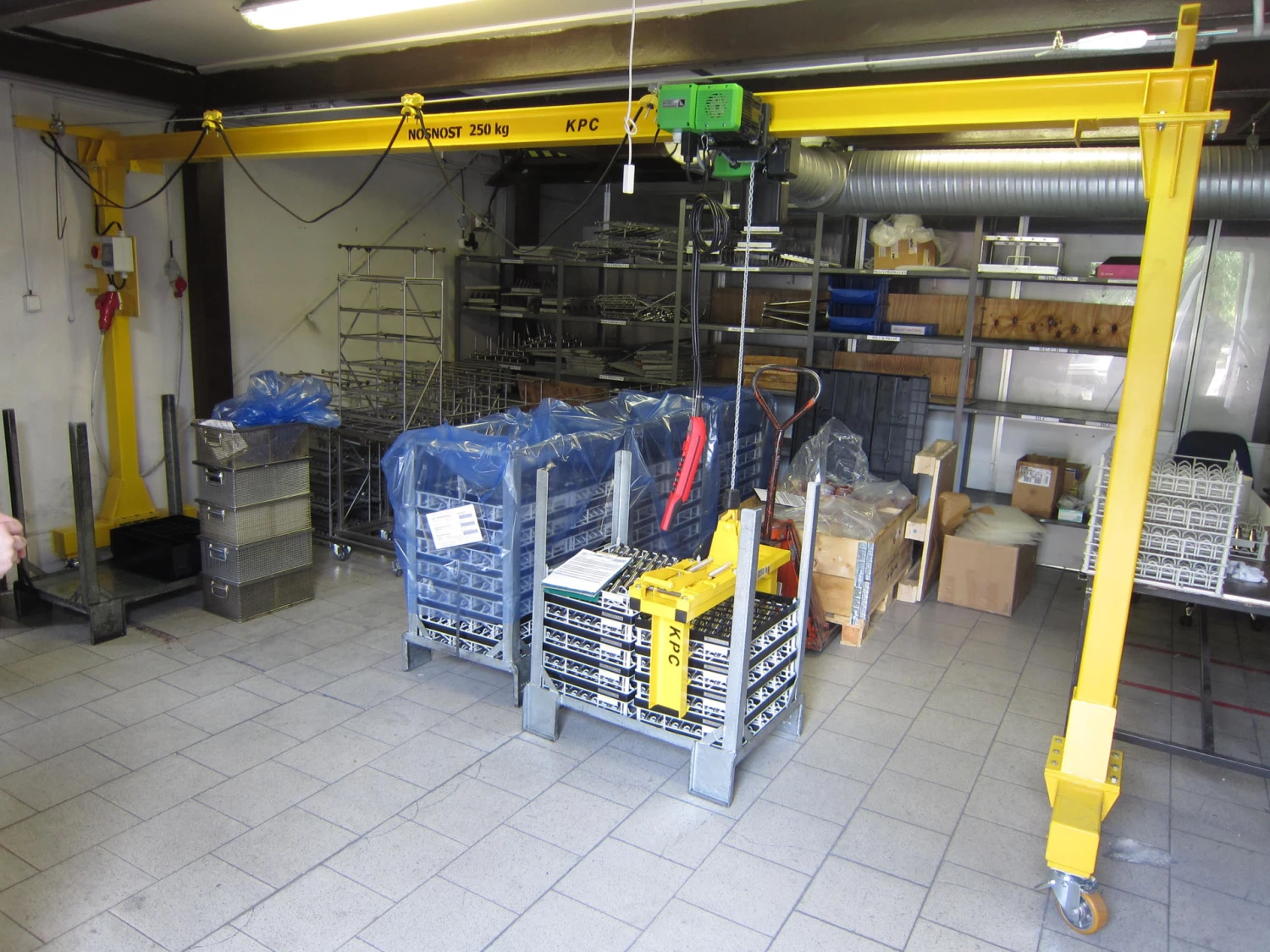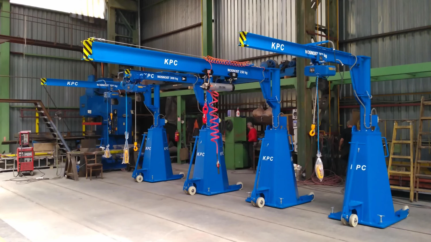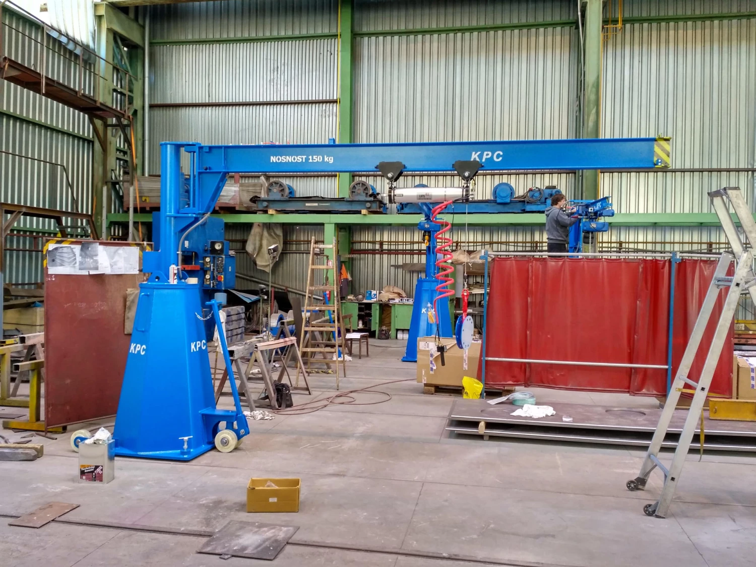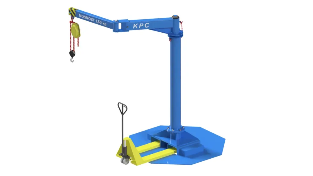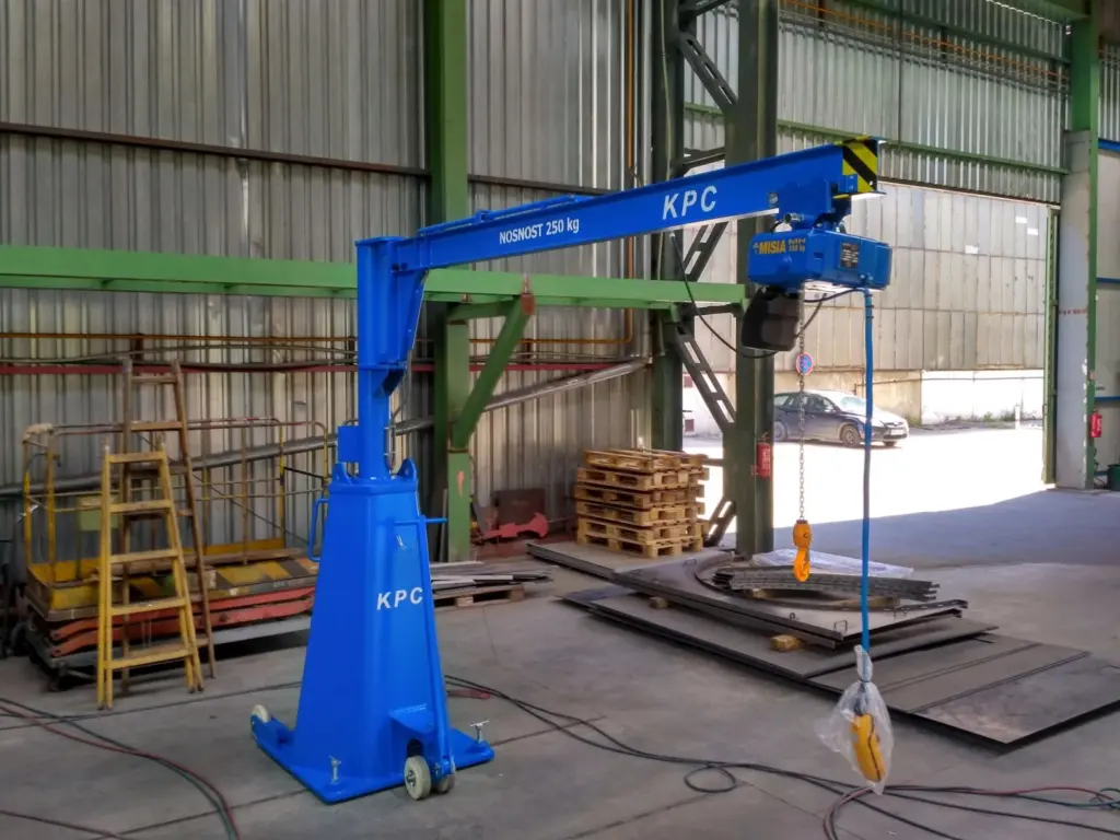 Mobilní sloupový jeřáb používáme tam, kde je potřeba flexibilně obsloužit konkrétní pracoviště bez zásahu do stavební konstrukce. Je tvořen sloupem s výložníkem po kterém pojíždí kladkostroj a celý komplet je umístěn na pojízdné základně. Lze jej tak ručně přesouvat mezi jednotlivými stanovišti podle aktuální potřeby výroby či montáže. Typicky slouží pro manipulaci s díly u strojů, montážních linek nebo v servisních provozech. Výhodou je jednoduchá instalace, možnost změny uspořádání pracoviště a ergonomická, bezpečná manipulace v dosahu výložníkového ramene. Ovládání bývá zpravidla řešeno závěsným ovladačem.