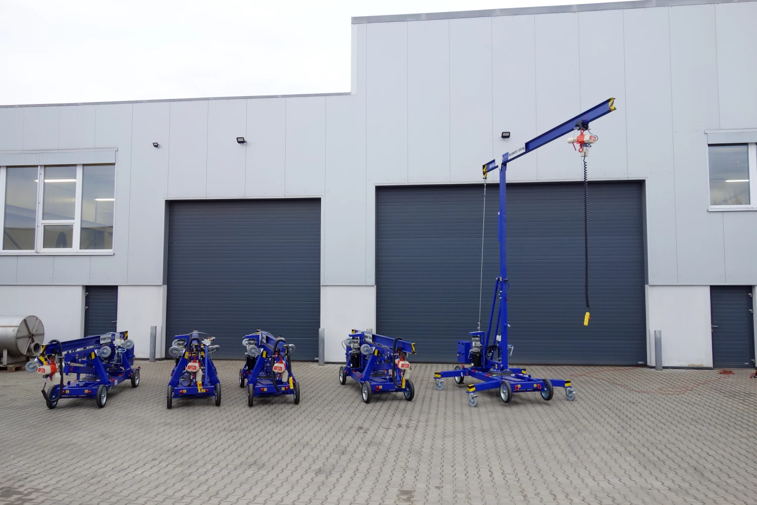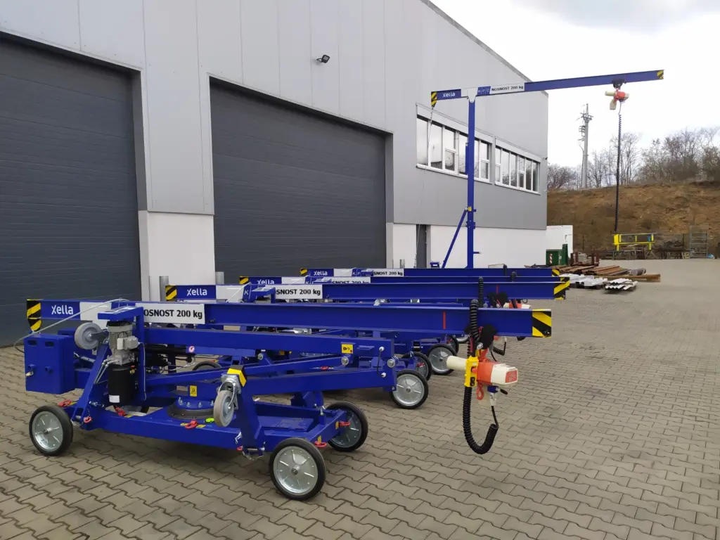 Mobilní stavební jeřáb o nosnosti 200kg je primárně určen pro přepravu břemen v dosahu otočného ramena při výstavbě budov. Jeřáb je ručně přemístitelný na čtyřech kolech (ve složeném i v rozloženém stavu), ale pouze bez břemene.