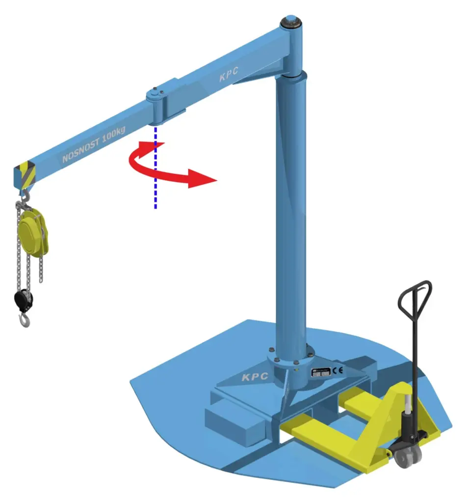 Mobilní sloupové jeřáby s lomeným ramenem jsou určeny pro vertikální i horizontální dopravu břemen v dosahu otočného výložníku. Jeřáb má pevnou základnu a lze jej snadno přemístit pomocí paletového vozíku, vysokozdvižného vozíku nebo zavěšením na mostový jeřáb. Konstrukčně se skládá z podstavce, sloupu a otočného lomeného ramene, na jehož konci je trvale zavěšen ruční nebo elektrický řetězový kladkostroj. Lomené rameno pokrývá manipulační prostor v rádiusu 1950 mm a produktová řada zahrnuje nosnosti 60, 100 a 150 kg.