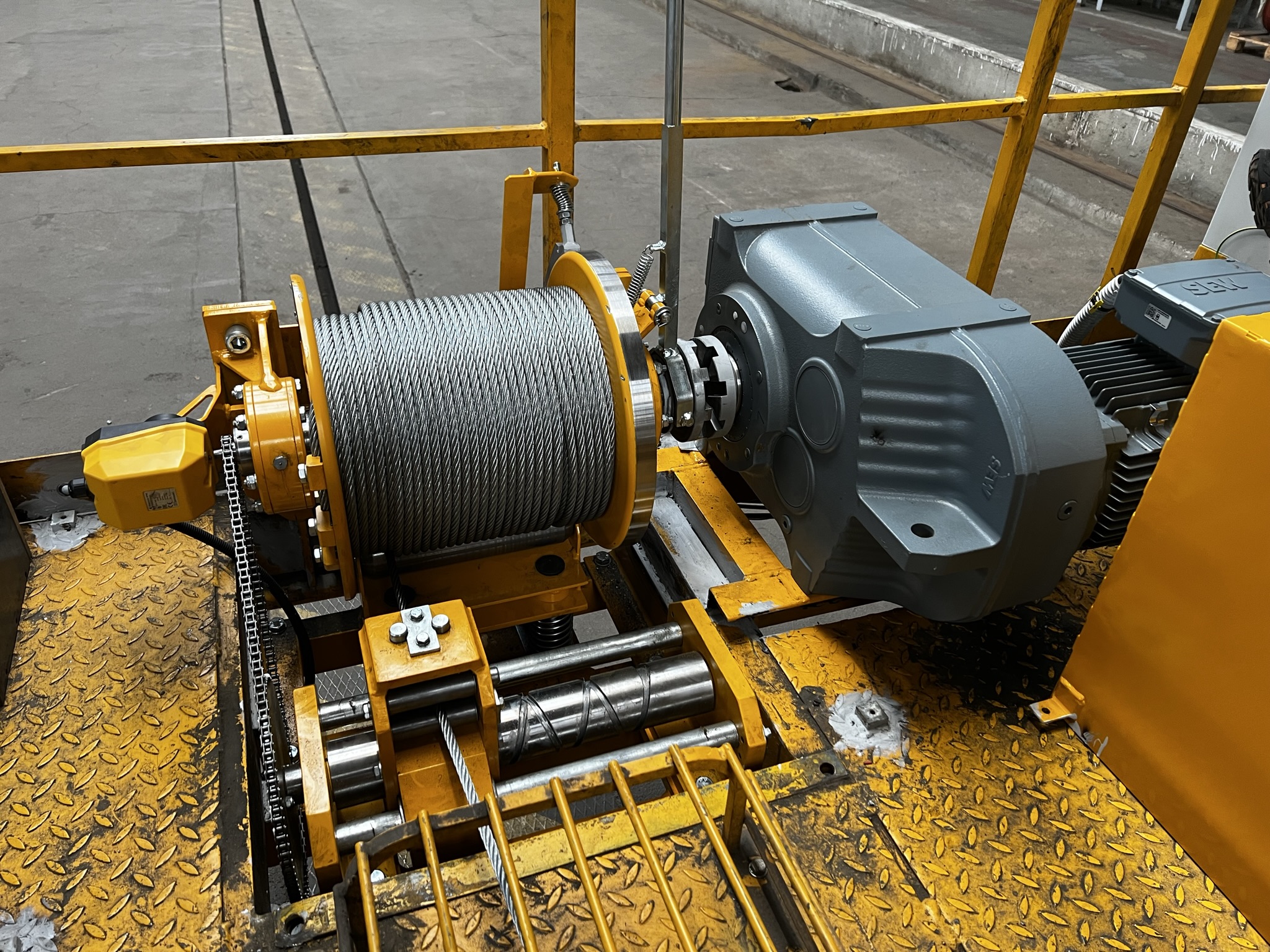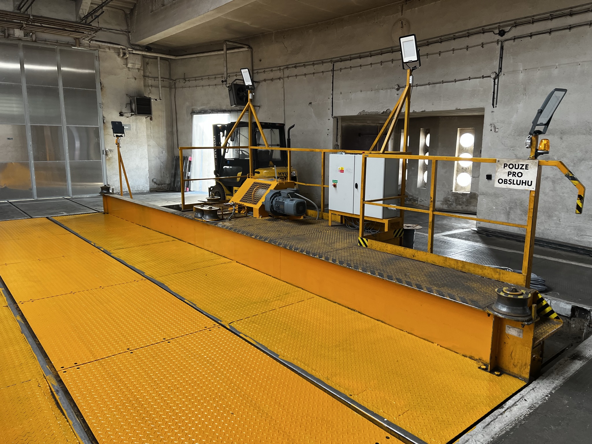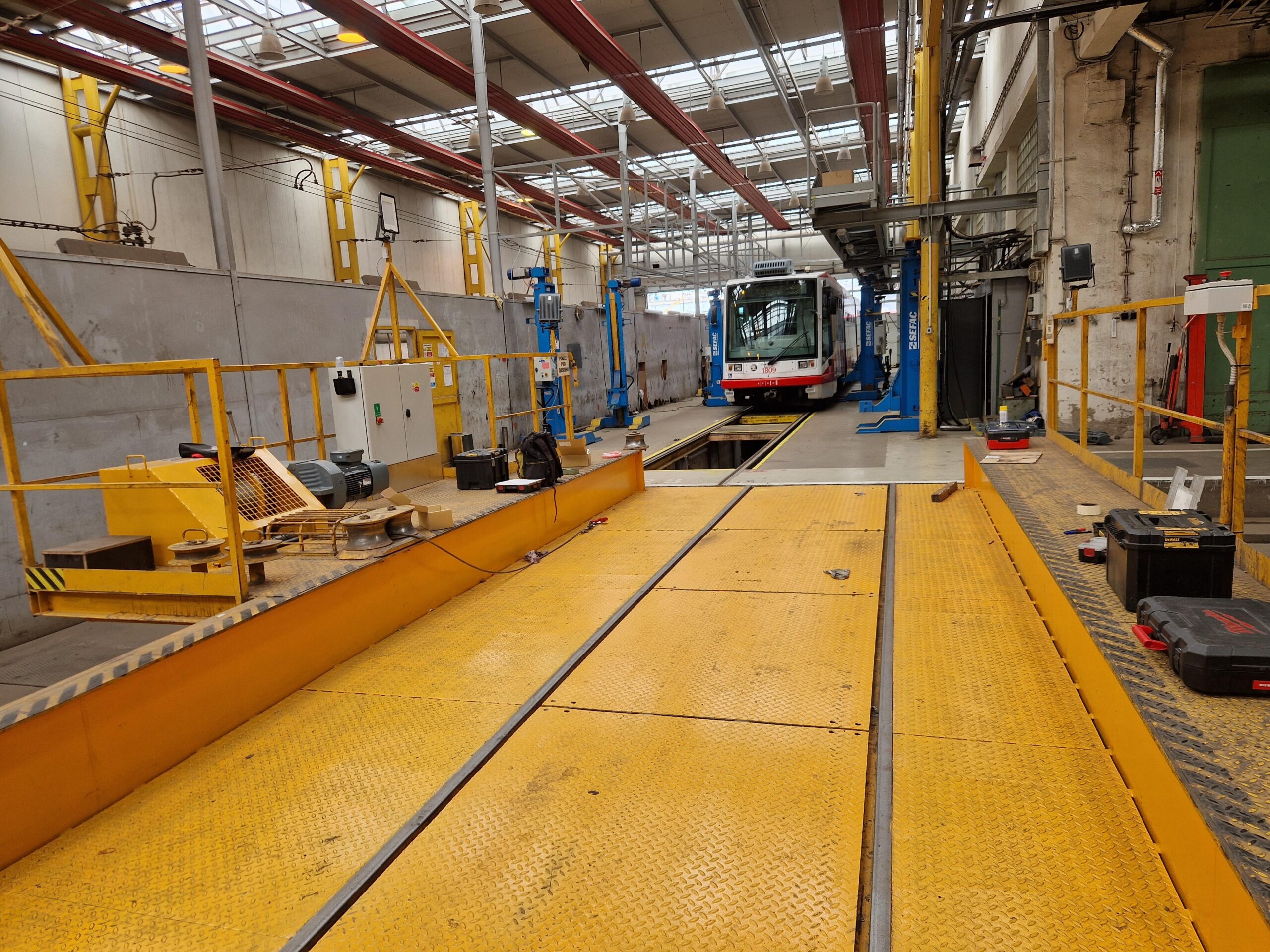V rámci modernizace jsme dodali zcela nový naviják přesuvny, nové pojezdové jednotky včetně kol, ložisek a hřídelí, dále pohonové motory s převodovkami, jejichž rychlost je plynule řízena frekvenčním měničem. Elektroinstalace byla doplněna o nový elektrorozvaděč, ovládací panely s bezpečnostními prvky, nový sběrač napájecí troleje, koncové vypínače pojezdu a antikolizní systém s optickou a akustickou signalizací (záblesková světla, LED reflektory, protisrážková čidla).